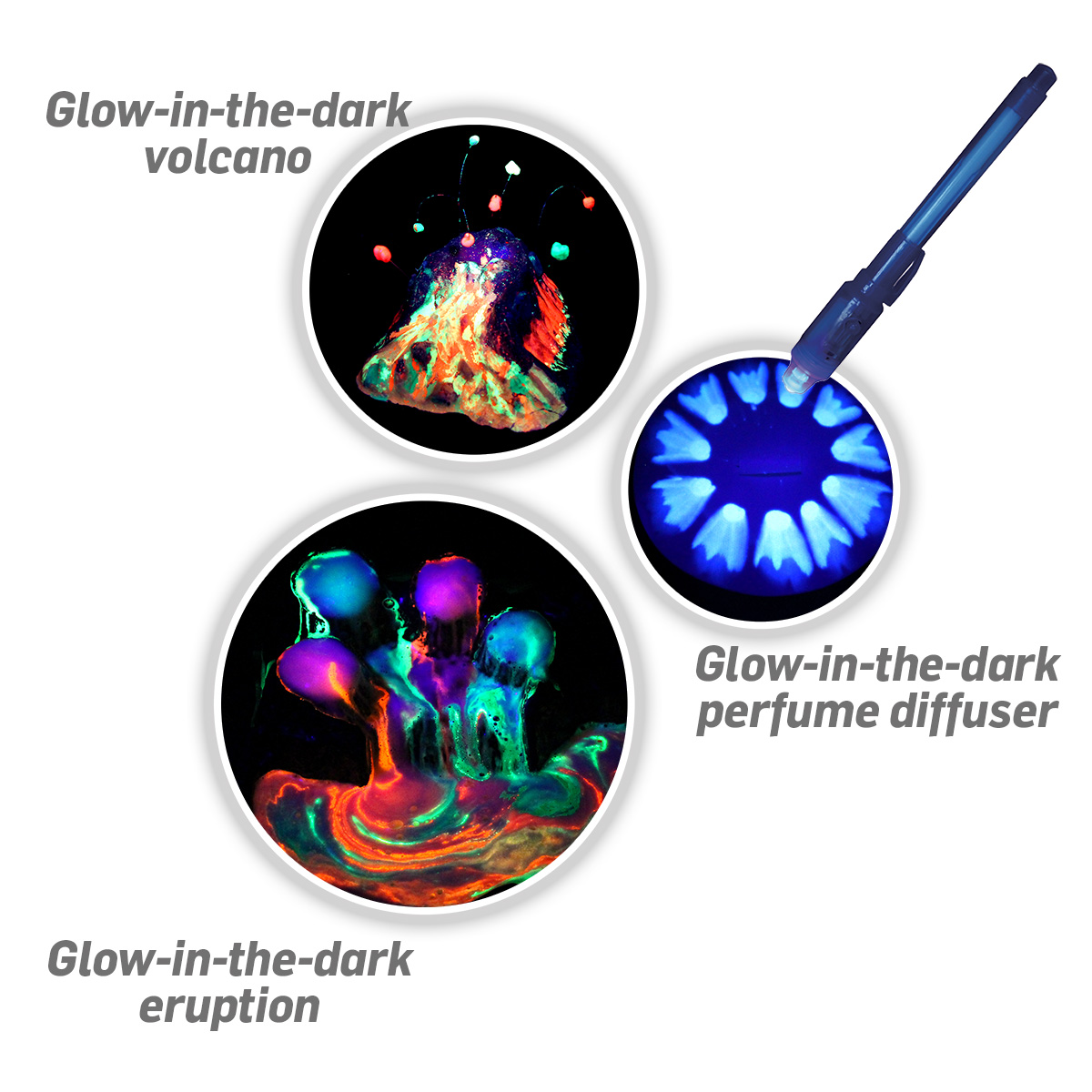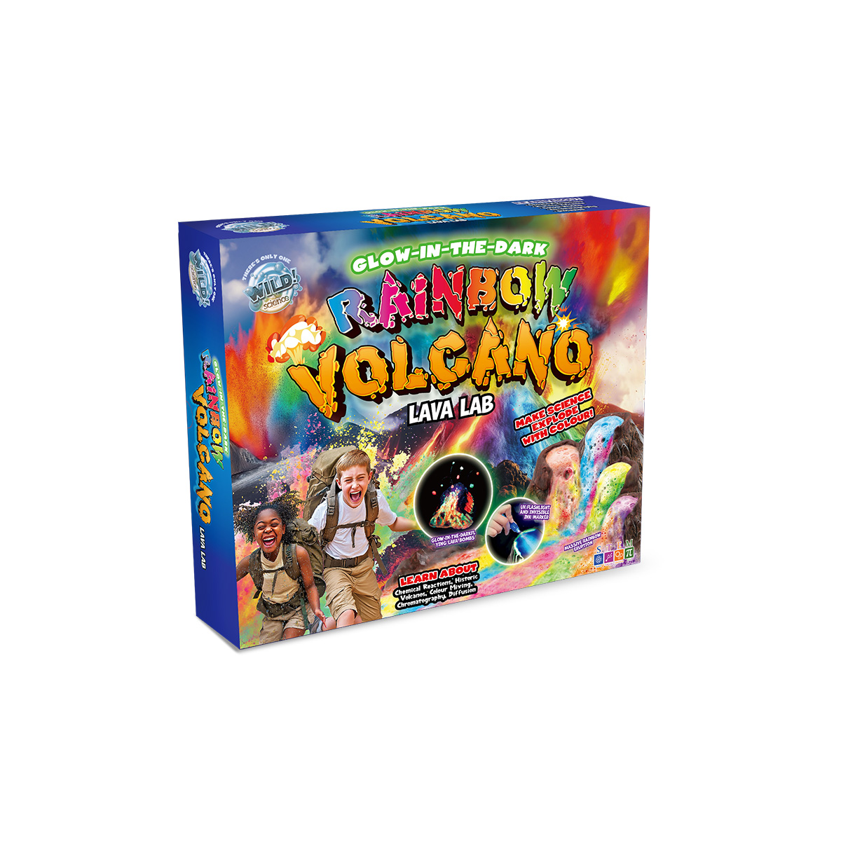 The Rainbow Volcano Lava Lab uses CREATIVE Chemistry and CREATIVE Physics to explore Geology and Art! The UNIQUE reusable Volcano Island has 4 craters and 11 calderas that produce a STUNNING variety of colourful visual effects and AMAZINGLY REALISTIC lava flows that Glow brightly in the Dark. Design Colour Morphing Chroma Flowers, create swirling Colour Storms in a special lake... and so much more.